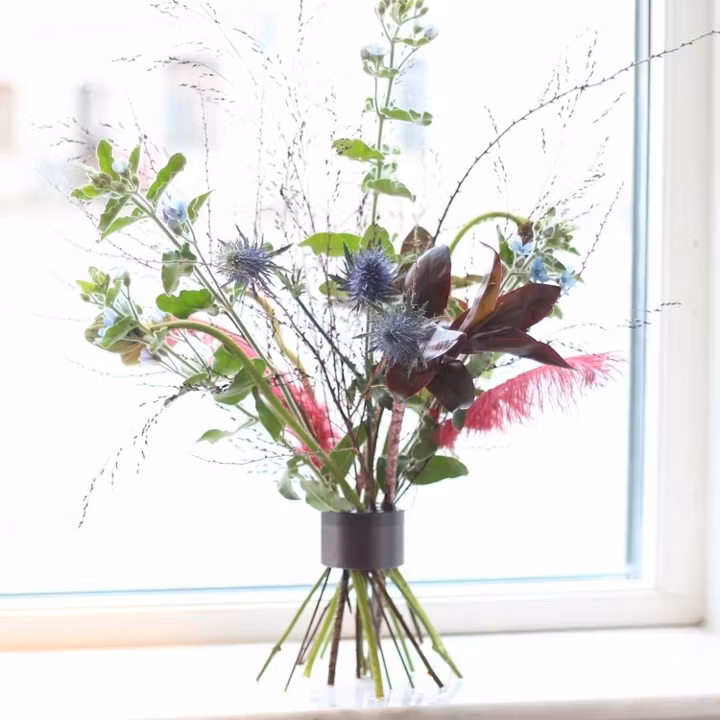 Køb et bundt blomster eller nogle løse afskårne blomster og suppler med smukt enggræs eller blomster fra grøftekanten. Arbejder med både frisk og tørret materiale, hvilket betyder, at du kan plukke materiale i naturen året rundt. Lad den kreative ånd og kreativitet flyde og skab buketter på en helt ny måde.