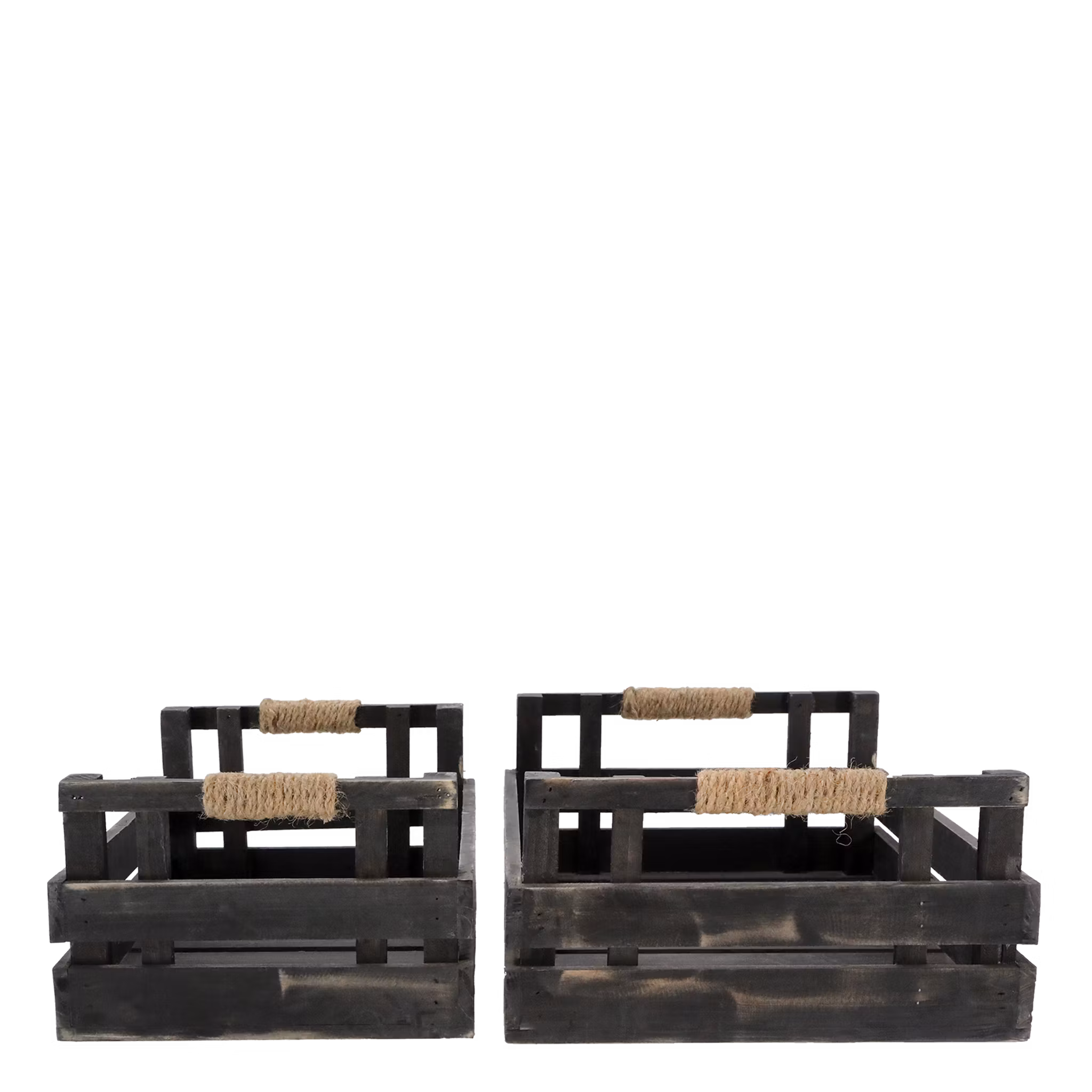Dekorative trækasser med håndtag, fremstillet i fyrretræ med flotte jutesnorshåndtag. Sættet består af 2 håndlavede kasser i forskellige størrelser, som giver et rustikt og naturligt udtryk i hjemmet.