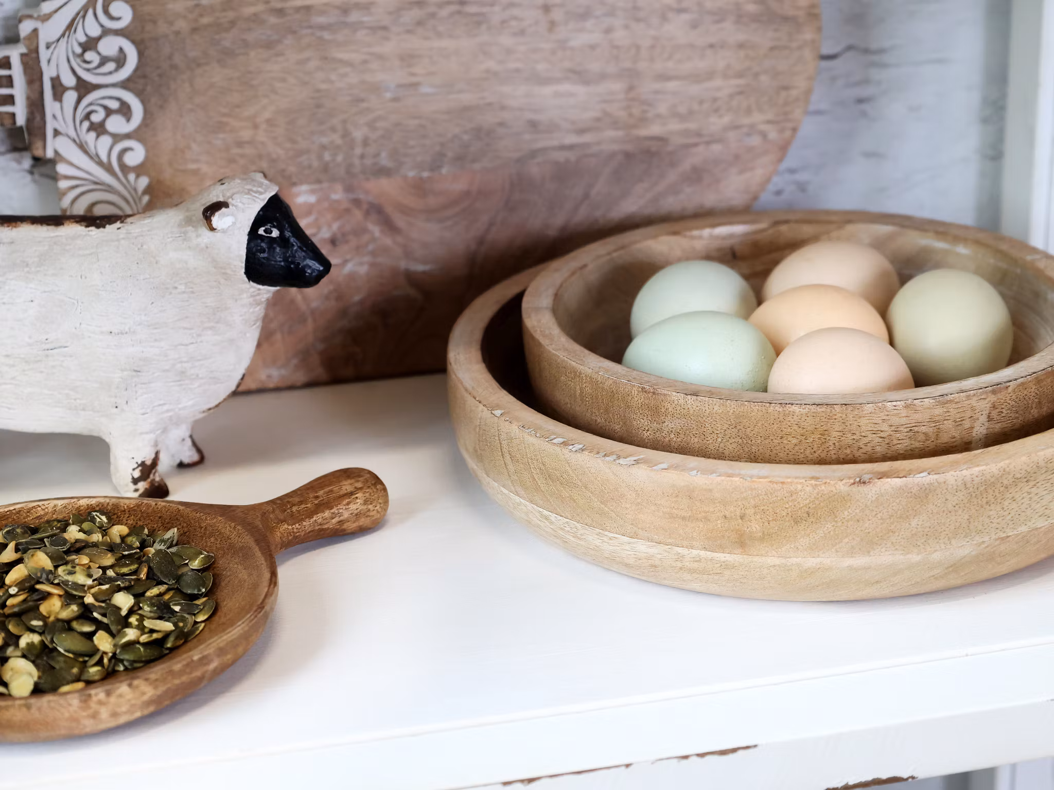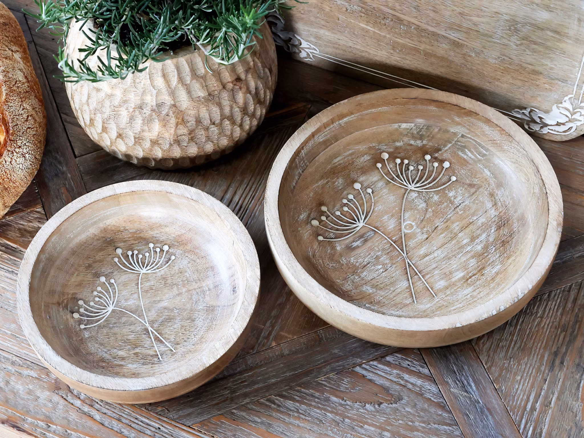 Tag din borddækning til et nyt niveau ved at tilføje disse skåle. De er smukt udført i massivt mangotræ med et fint blomstermønster udskåret med hvide konturer, og de vil bringe en vidunderlig varme til bordet.