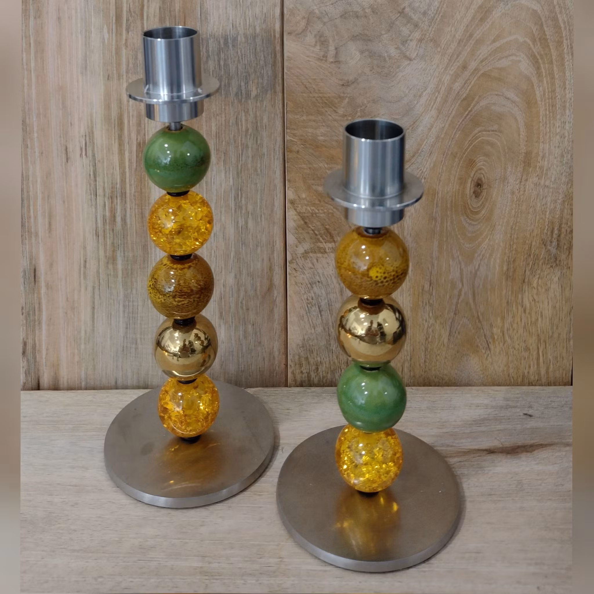 Sættet består af 2 stager i stål, 1 x 4 kugler H 17,5 cm og 1 x 5 kugler H 20,5 cm med viste kugler