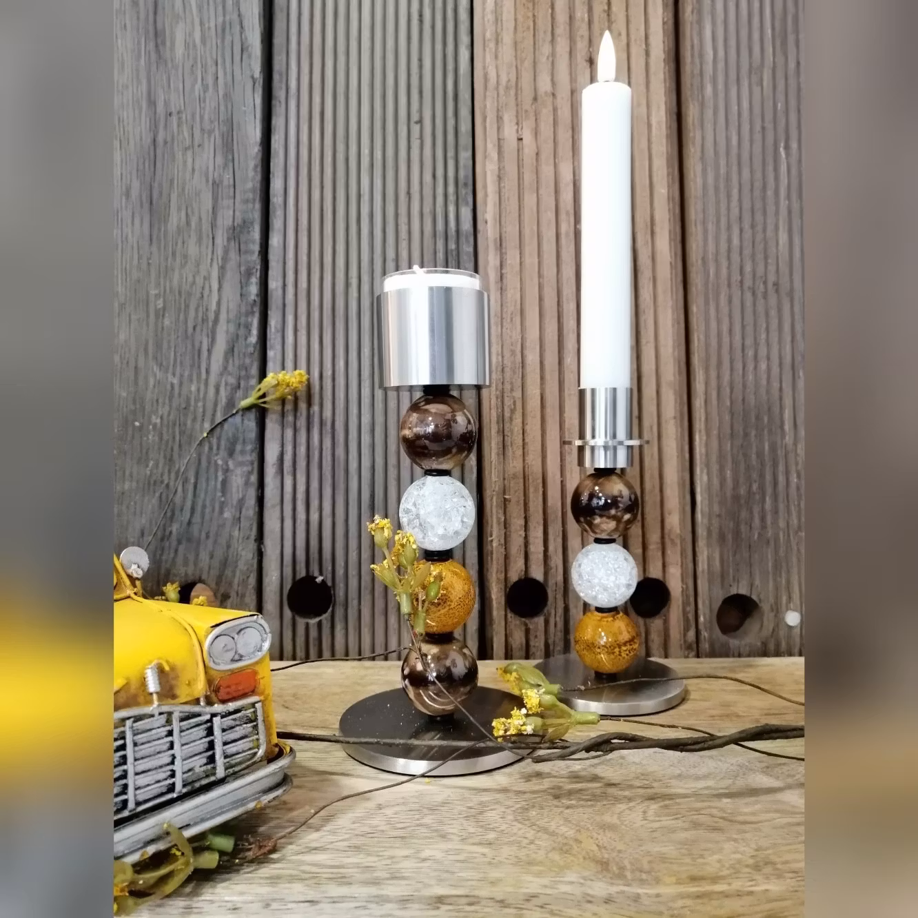 Sættet består af 2 stager i stål, 1 x 3 kugler H 14,5 cm og 1 x 4 kugler H 17,5 cm med viste kugler