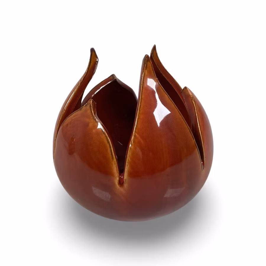 En stearinlyslygte lavet af stentøj med en reaktiv glasur, det betyder, at der kan være farveskift, der gør hver lanterne unik i sit udtryk