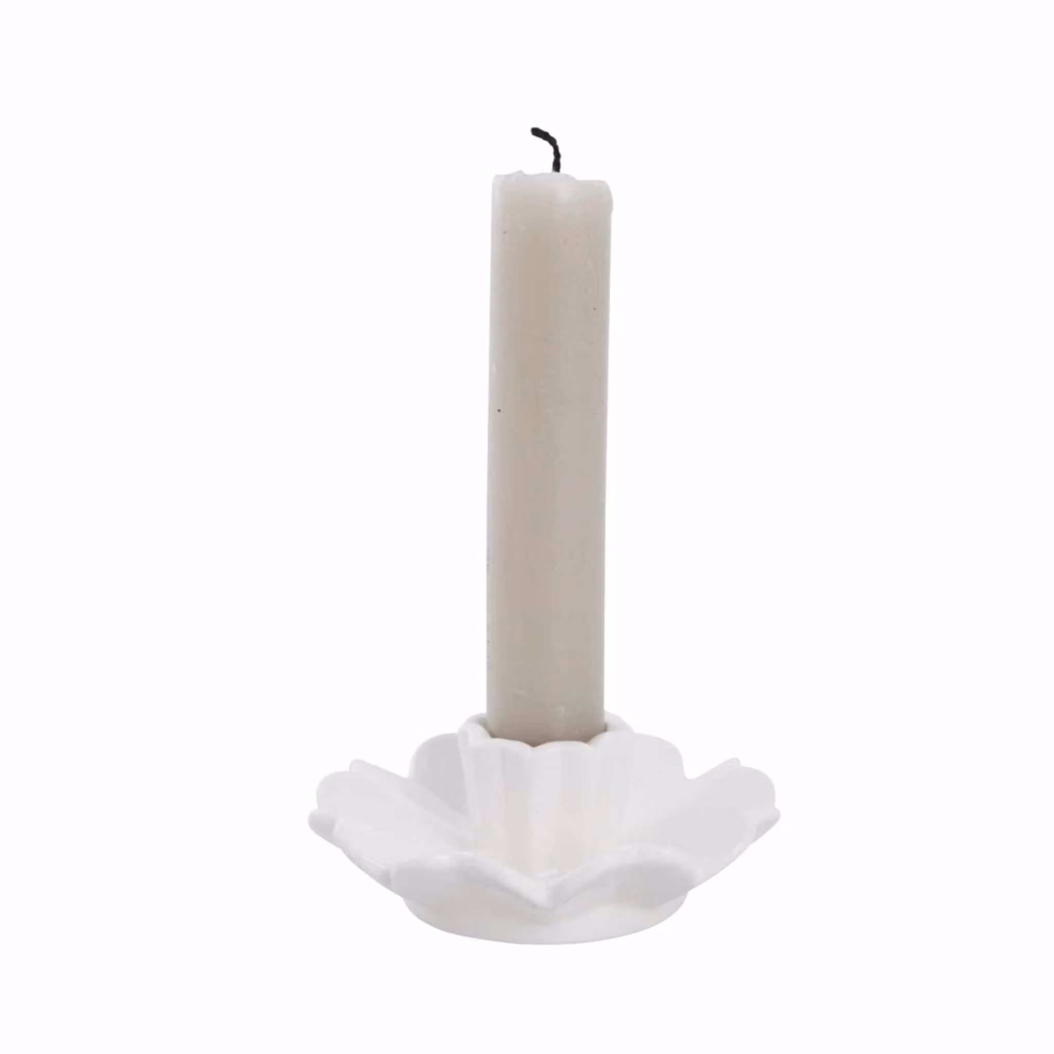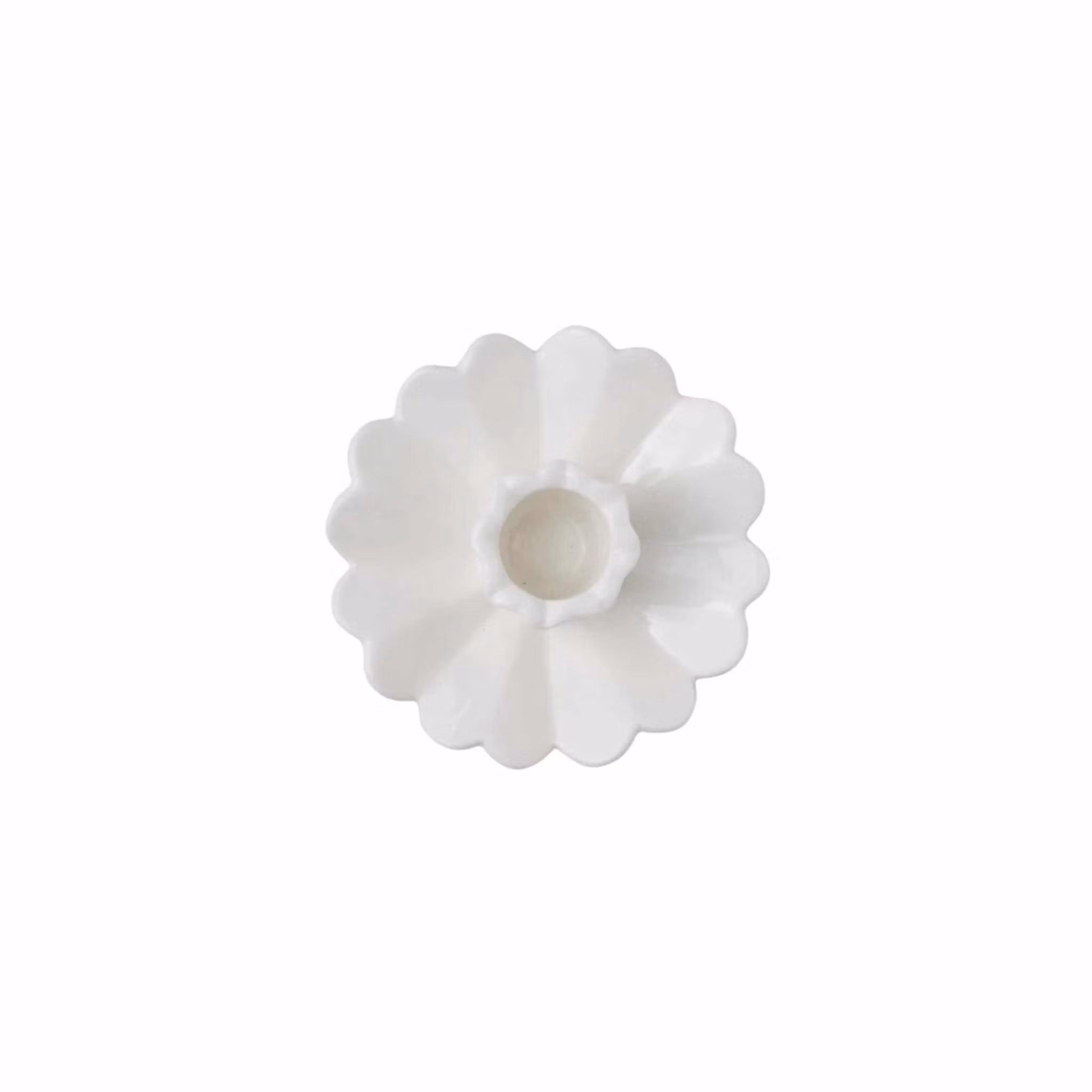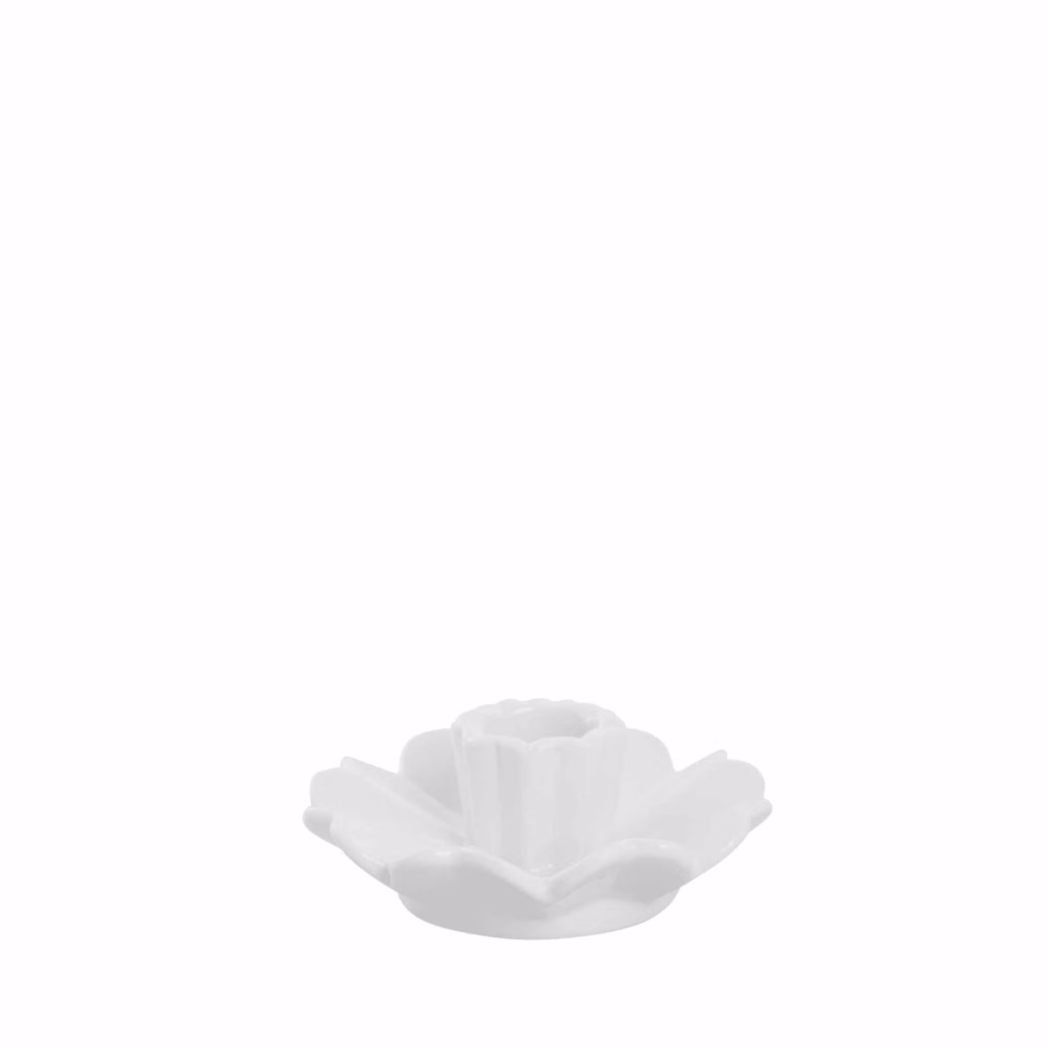 Smuk keramisk lysestage formet som en blomst med et dejligt ribbet mønster, der giver den et raffineret og stilfuldt udseende. Lysestagen har en solid base, der sikrer stabilitet og en lille holder til alm. lys.