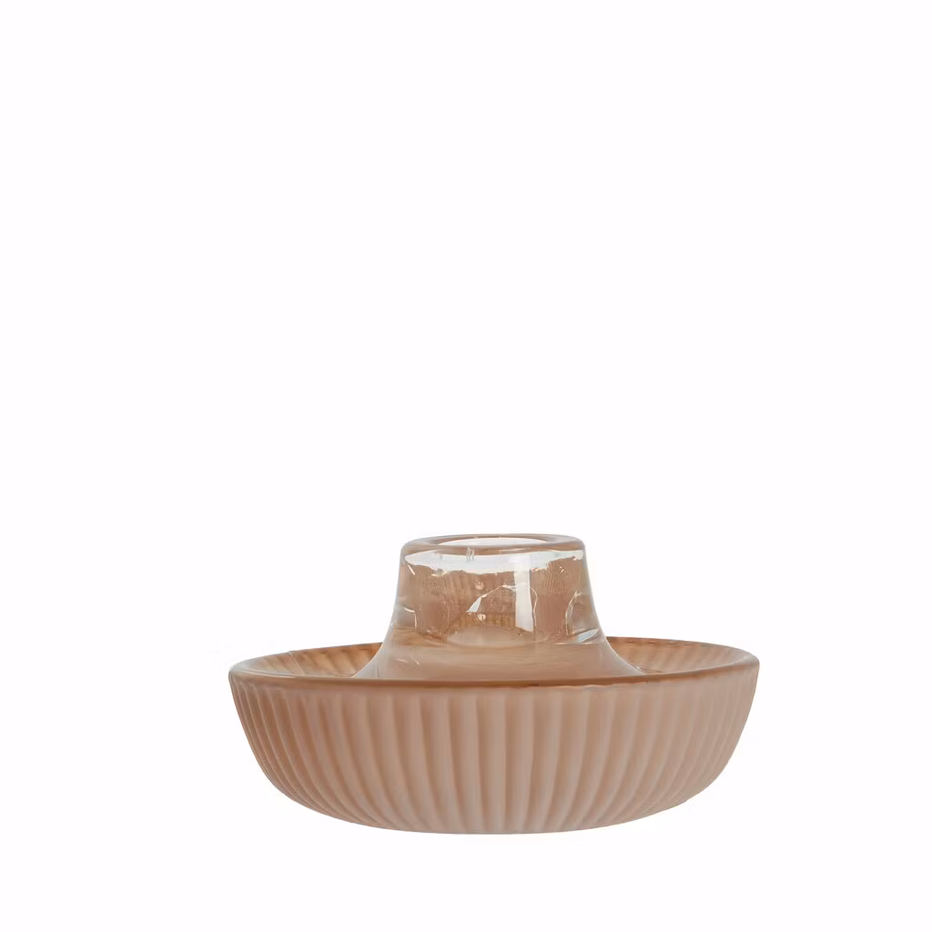 Dobbelt stage som både passer til fyrfadslys og kronelys. Fremstillet i glas - farve gyldenbrun