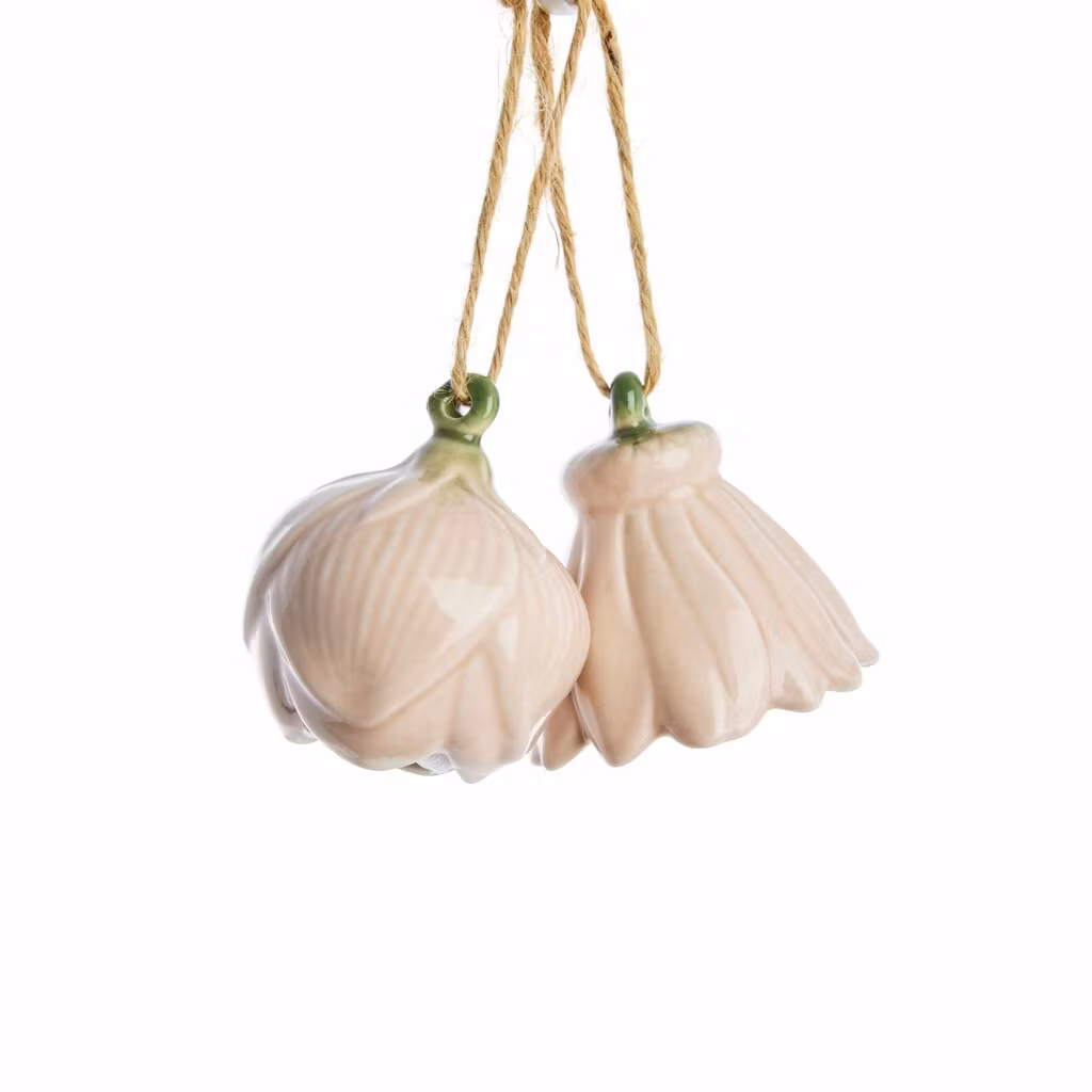 Ophænget er lavet af keramik og malet i en lys rose farve med en grøn top, der minder om en blomst, der netop er sprunget ud. Den hænger fra en simpel jutesnor, hvilket gør den let at placere i forskellige omgivelser, såsom i vinduet, på en gren eller som en del af en større dekoration.